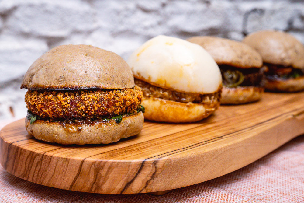 The baus are made in-house and come stacked like little sandwiches with fillings of confit duck leg, crunchy pork belly, wild mushroom and tofu, chicken, and salted black cod.