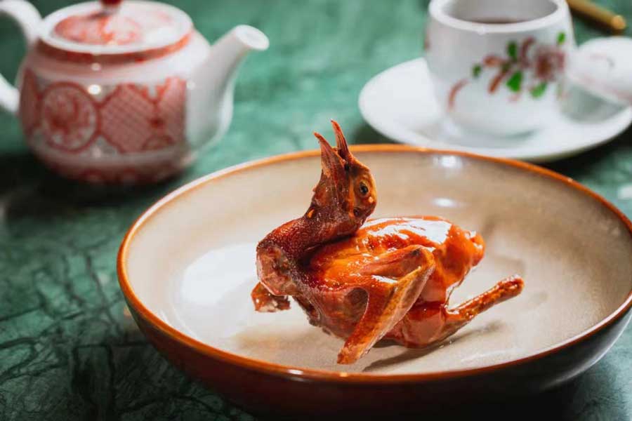 There are many iconic dishes on the menu at Dim Sum Society, and one of them is the Shiqi crispy pigeon from Zhongshan, Guangdong.