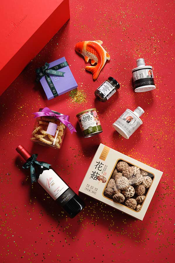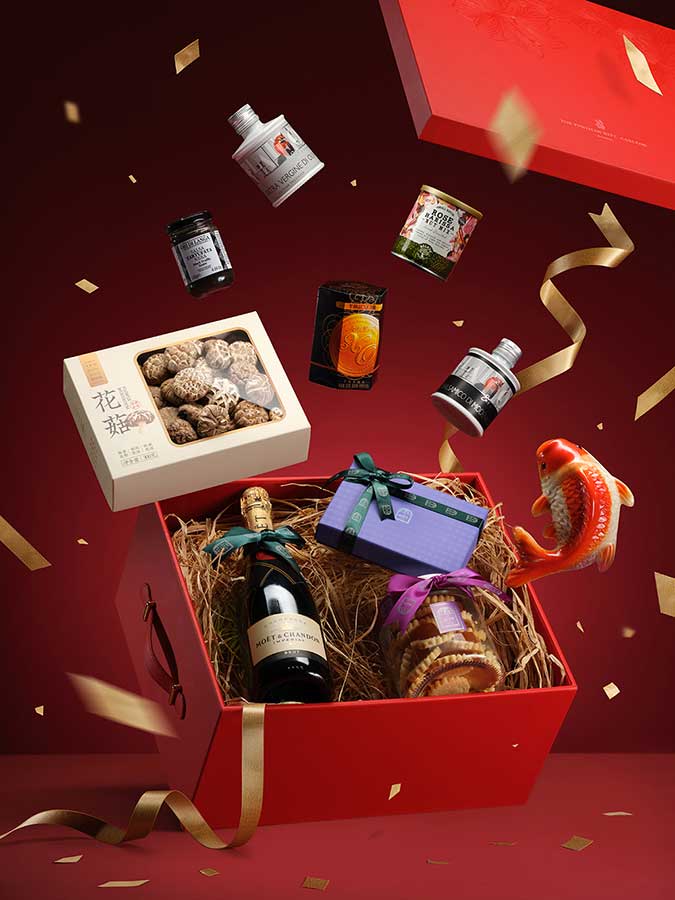 The beautifully presented boxes include a bottle of Moët & Chandon Brut NV champagne, Chinese New Year rice cake, an assortment of nuts, chocolate pralines, pineapple tarts, black truffle sauce, extra virgin olive oil, balsamic vinegar, XO sauce, and dried mushrooms.
