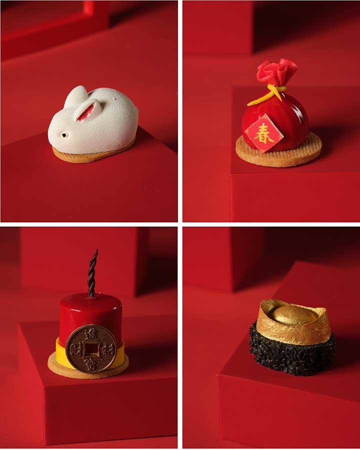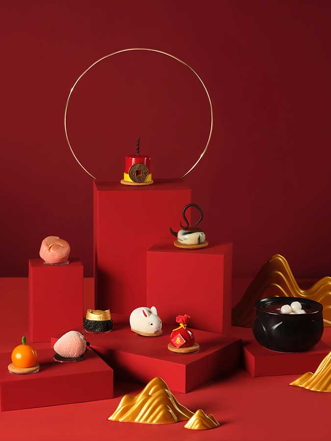There are four savory bites and four sweet treats, as well as a red bean soup with glutinous rice balls and scones. Highlights include White Rabbit mousse, lucky salmon and tangerine spheres, strawberry hawthorn flower tea cake, and basil & cherry mousse cake lucky bags.