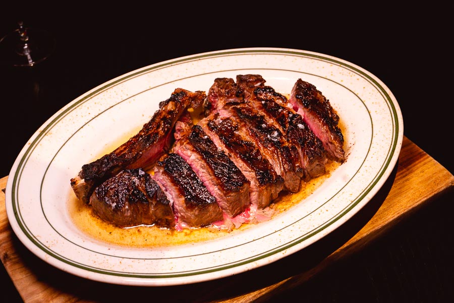The steak is cooked the Peter Luger way, which is, to crust it in salt and cook it under the broiler on high heat with sizzling butter. The salt crust is removed, the beef is removed from the bone and sliced, and placed back onto the grill for a final char.
