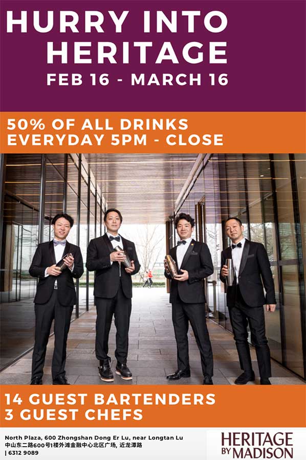 The team at Heritage by Madison has banded together a powerhouse line-up of Shanghai famous bartenders and chefs for guest shifts over four weeks. On top of the special events, ALL DRINKS at Heritage are 50% off, everyday from 5pm until close.