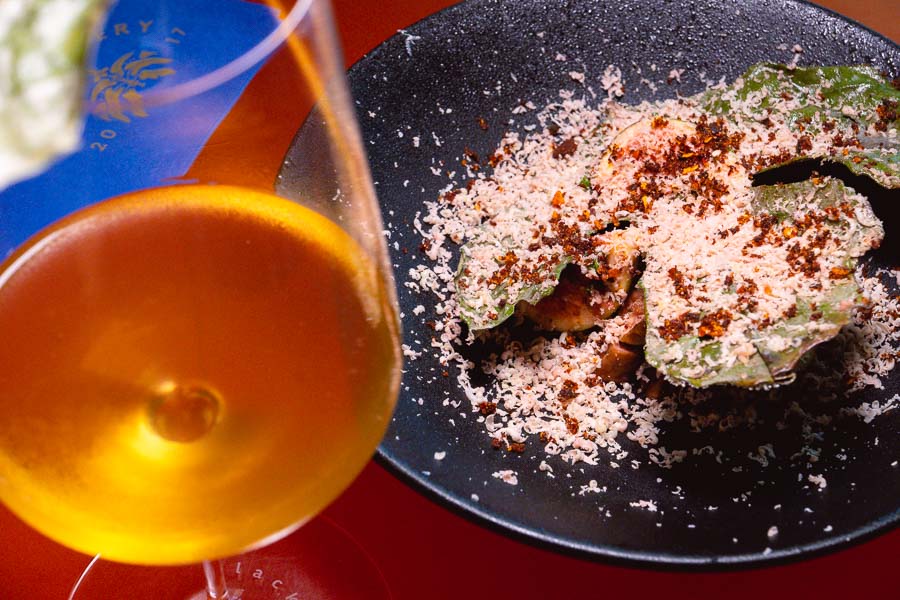 Paired with “Monkey 47 Sloe Gin Cocarrot Colada”, a hot-and-cold cocktail of icy sloe gin with pineapple and lime, and a warm foam of carrot and coconut cream topped with Guizhou mountain pepper.