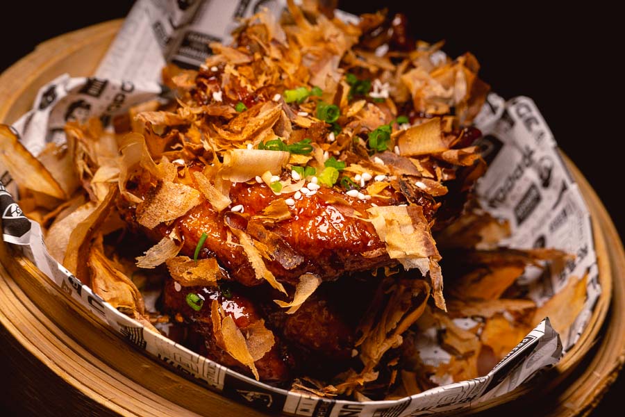 Japanese-Style Teriyaki Fried Chicken (¥78) – Sweet and savory teriyaki glazed wings with an avalanche of bonito flakes.