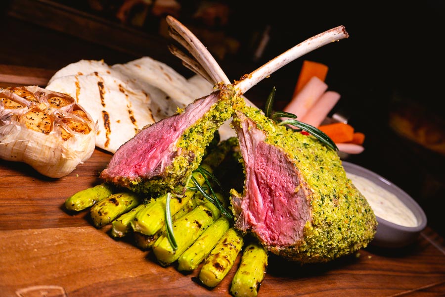 Roasted Lamb Chops (¥368) – A rack of chops crusted with pistachio and cumin, roasted to medium doneness, served with grilled asparagus. It is a dish inspired by kebabs, hence the flatbread and mint yogurt sauce.