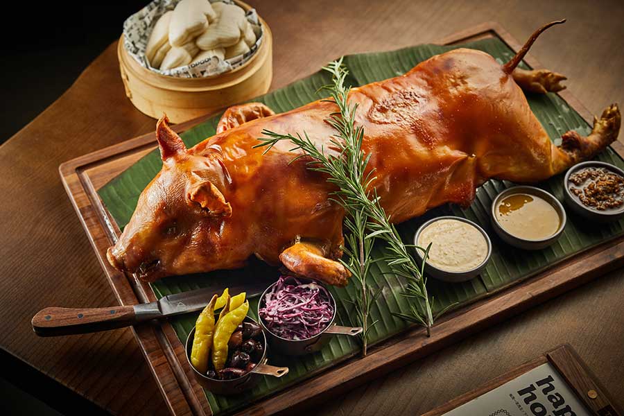 If you’re going with a large group, get the signature Crispy Suckling Pig (¥888/half, ¥1,688/whole). Comes with gua bao buns, slaw, guindilla peppers, olives, and sauces.