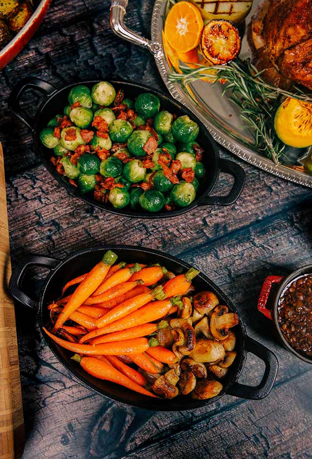 Side dishes include bread stuffing with homemade bacon, celery, and caramelized onions, rosemary-roasted potatoes, honey-glazed carrots, Brussels sprouts with bacon, honey-glazed pumpkin, sautéed broccoli with toasted almonds, and cranberry sauce and turkey jus.