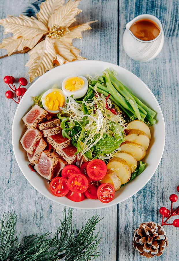 For salad, choose one from four: Victor’s Salad (shrimp, smoked salmon, mixed lettuce, avocado vinaigrette dressing), Caprese Salad (tomatoes, mozzarella, fresh basil, pesto and balsamic vinegar dressing), Greek Salad (feta, red onions, cherry tomatoes, kalamata olives, cucumber, red wine vinaigrette), or Salade Nicoise (confit fresh tuna, beans, eggs, tomatoes, baby potatoes, bell peppers, vinaigrette dressing).