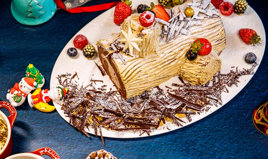 Dessert is a traditional chocolate and coffee Yule Log.
