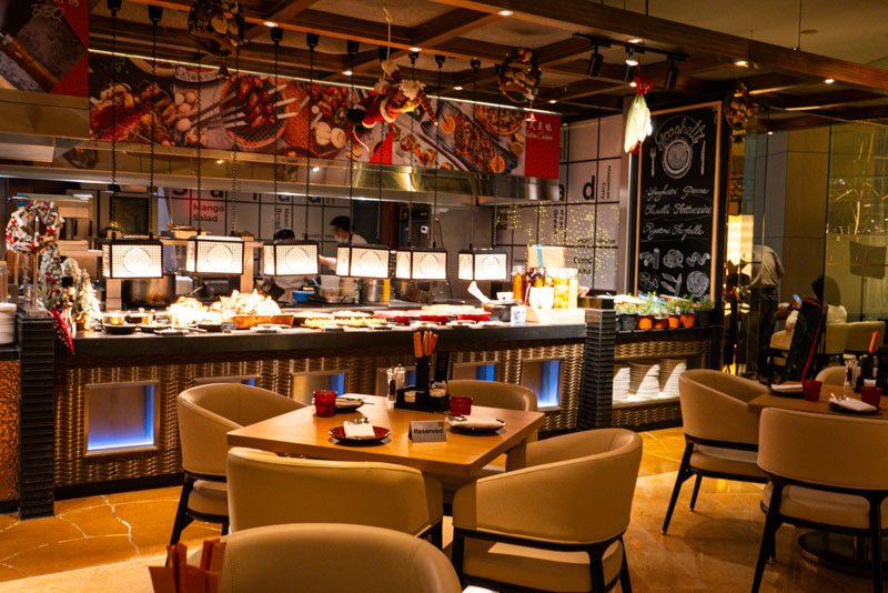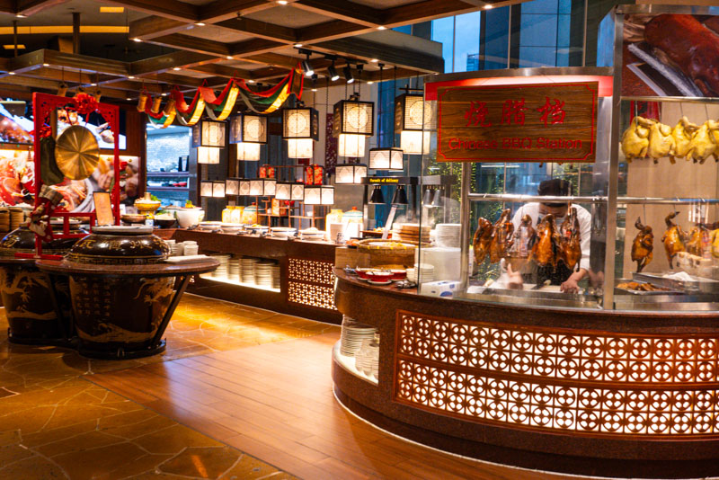 Not only is the entire hotel decked out in holiday cheer, but YICAFE is all geared up for a festive buffet available through December — roasted turkey, slow-roasted beef short rib, suckling pig, 10 live cooking stations, and a dozen cuisines all in one locale. Free-flow available.