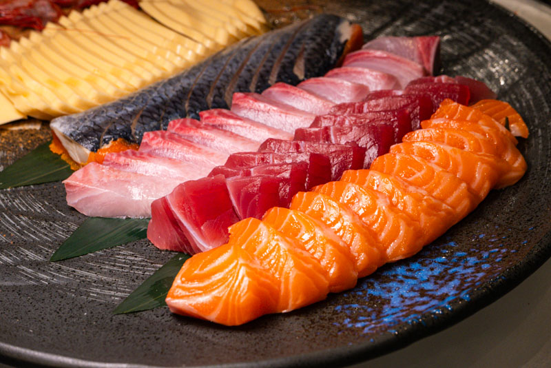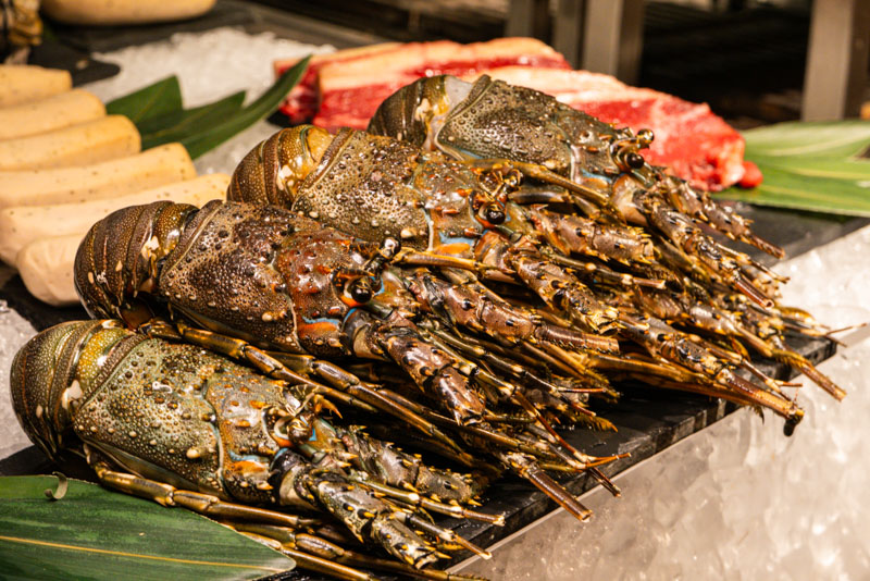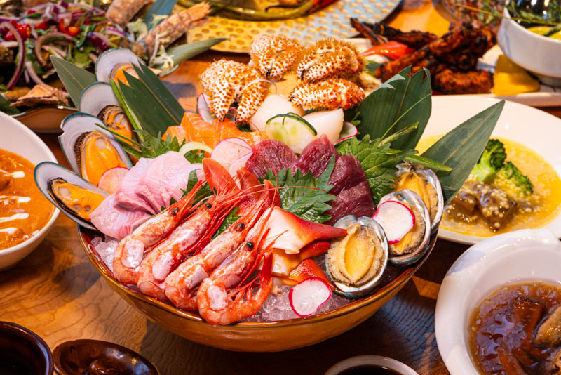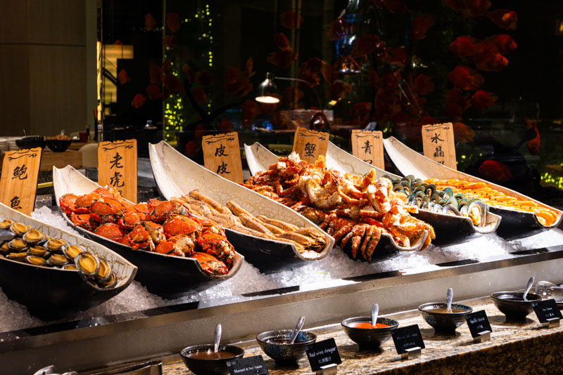 The fresh seafood is also one to make a beeline for. Fresh seafood on ice includes steamed and poached abalone, prawns, mantis shrimp, crab, king crab legs, and more, as well as sashimi of tuna, salmon, and herring with fish roe.